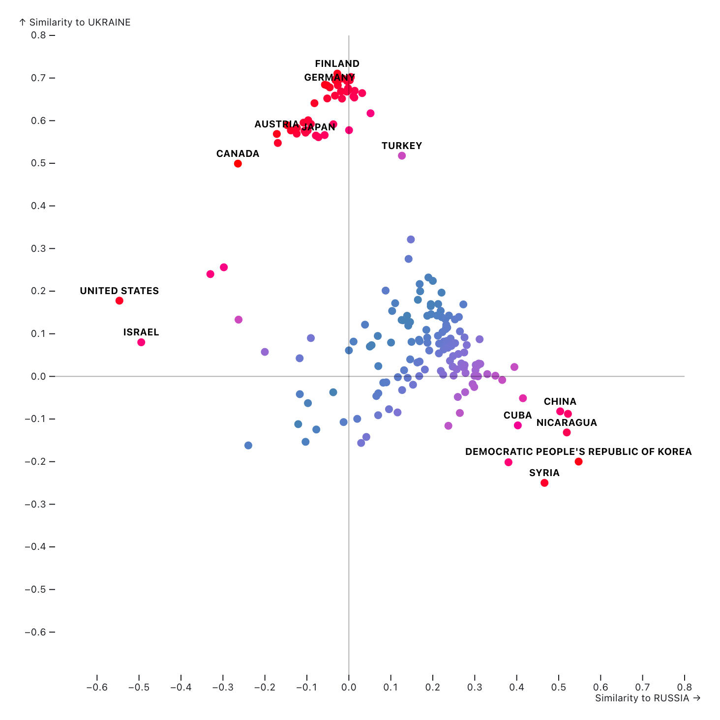 Plot analysis of all United Nations General Assembly votes from 2020 to 2024 (covering 719 proposals), showing each country's average voting similarity to Russia and Ukraine.